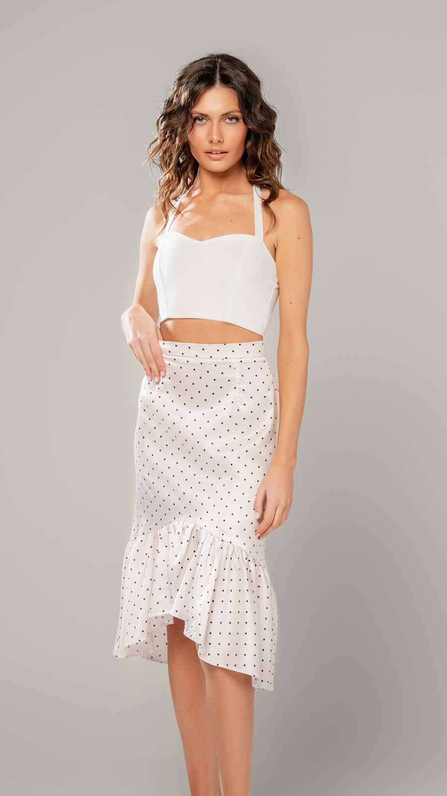 Η Ethereal Dots Skirt είναι μια μίντι φούστα με διαχρονικό πουά print και ρομαντικό βολάν στο τελείωμα, που χαρίζει κίνηση και θηλυκότητα σε κάθε βήμα. Η ψηλόμεση γραμμή της αγκαλιάζει το σώμα με κομψό τρόπο, ενώ το βολάν προσθέτει μια ανάλαφρη, παιχνιδιάρικη διάθεση.