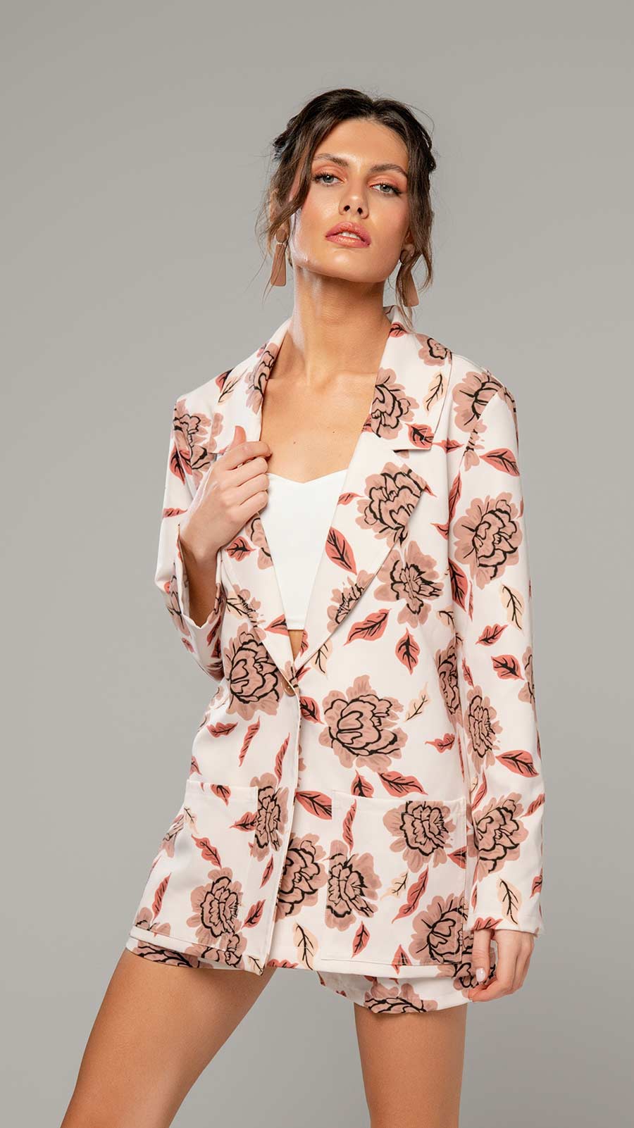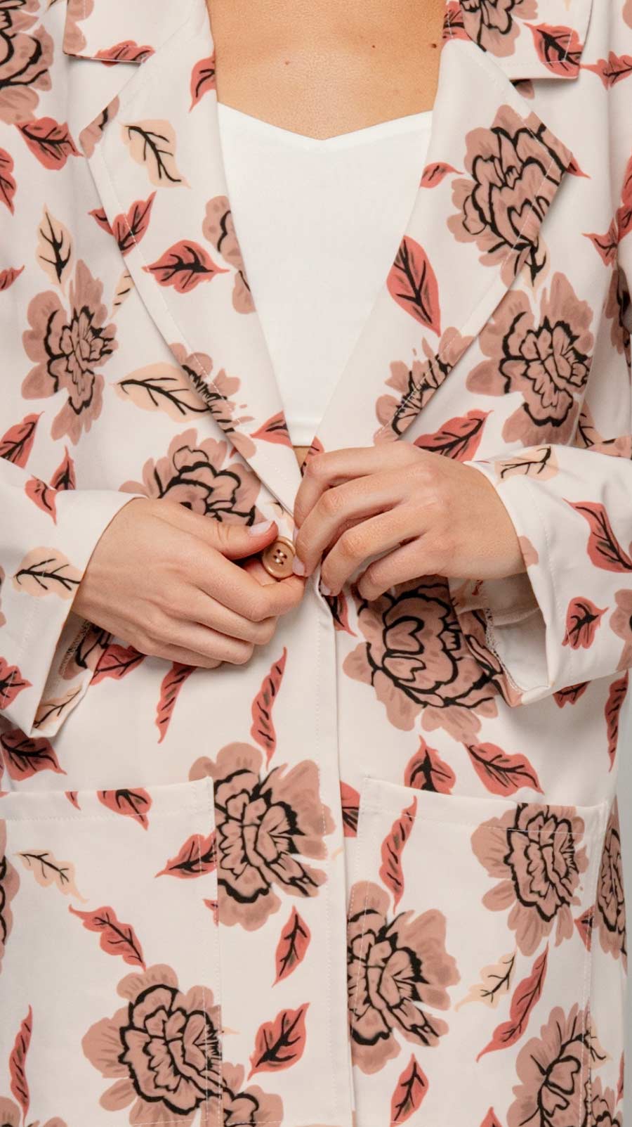 Αναβάθμισε κάθε σου εμφάνιση με αυτό το statement σακάκι! Το Floral Power Jacket συνδυάζει την κομψότητα με τη θηλυκή δυναμική, χάρη στο εντυπωσιακό λουλουδάτο print σε απαλές αποχρώσεις του ροζ και του μπεζ. Το εκρού με τα καφέ λουλούδια αποπνέει μια κομψή, φυσική αρμονία – ιδανική για chic και διαχρονικές εμφανίσεις.