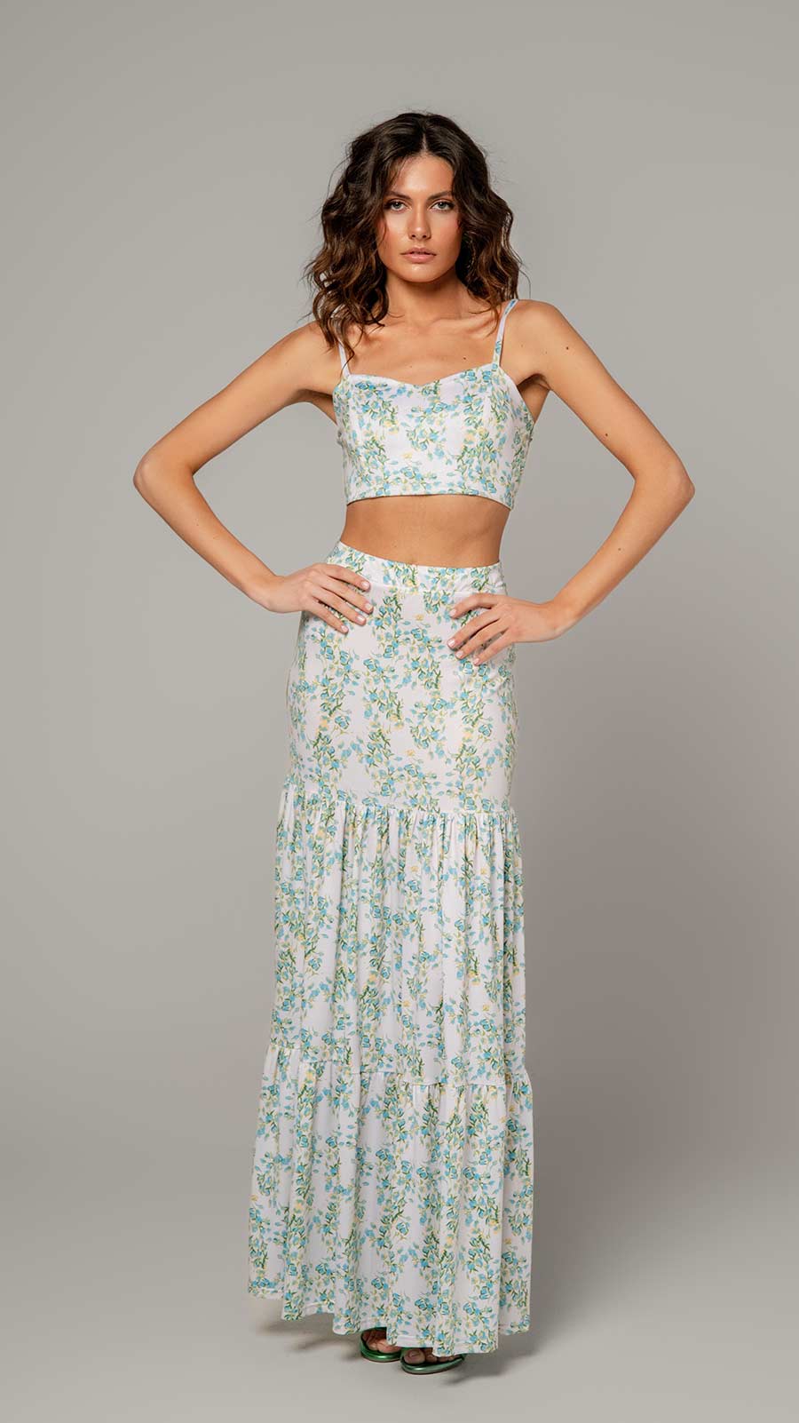 Το λουλουδάτο print σε παστέλ αποχρώσεις του mint και του πράσινου πάνω σε λευκή βάση χαρίζει μια ανάλαφρη, ρομαντική αισθητική που ταιριάζει ιδανικά στις ηλιόλουστες μέρες.